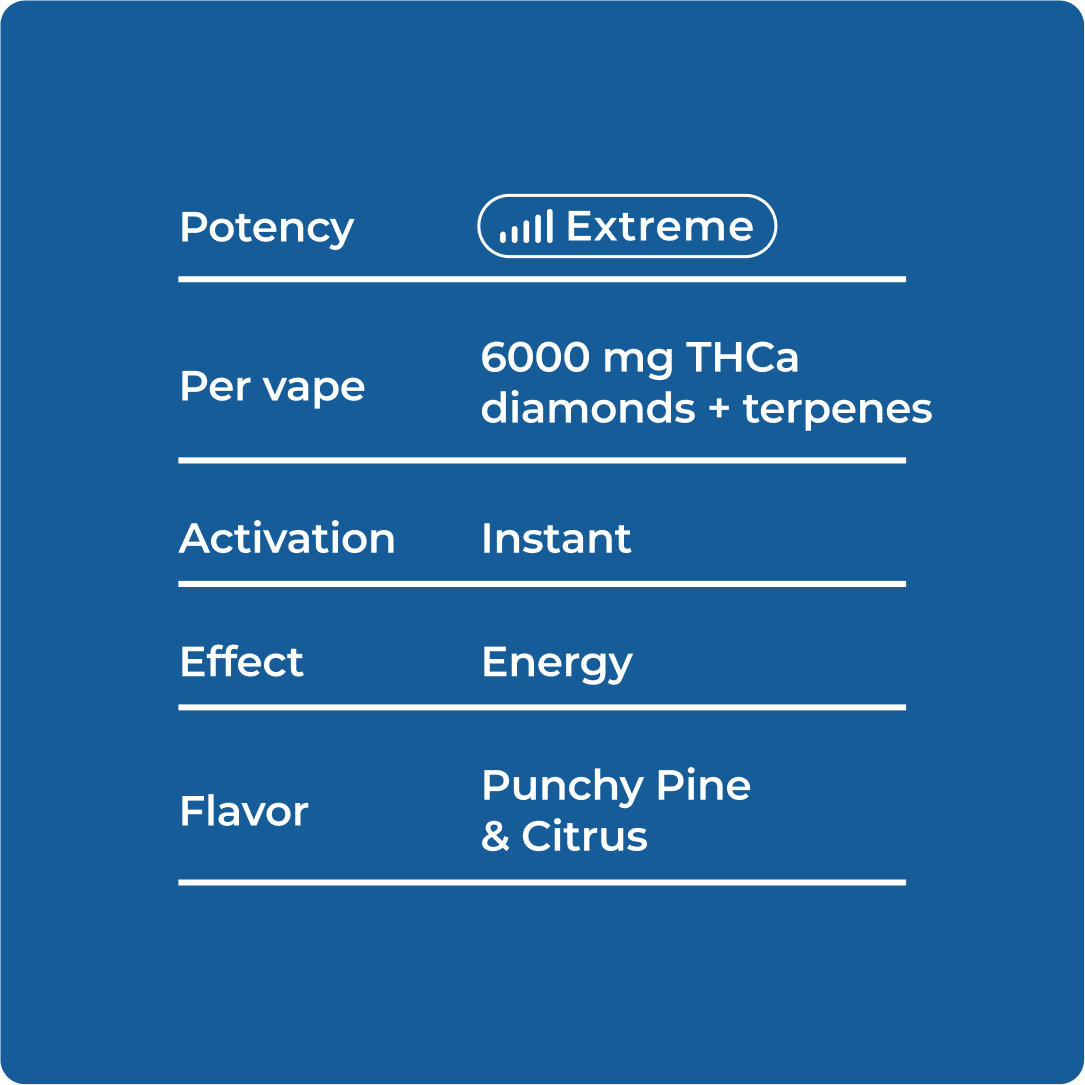 A powerful 6g THCA diamond vape, Alaskan ThunderF*ck delivers invigorating energy, pinpoint mental clarity, and bold pine-citrus flavor in every long-lasting draw.