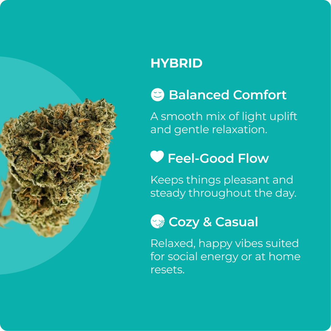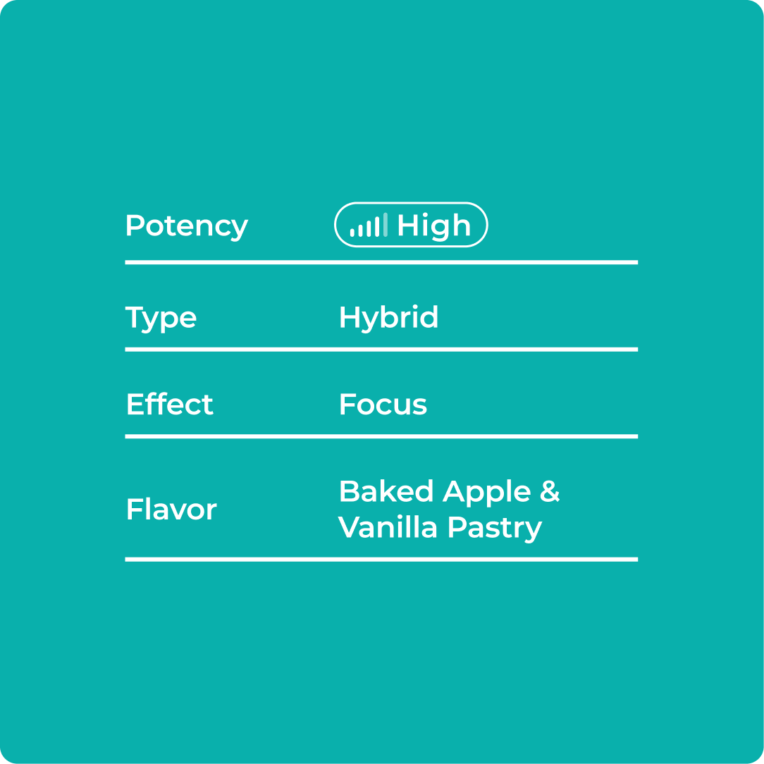 Cozy dessert notes paired with a happy, balanced headspace and gentle body ease. Warm, bakery-sweet comfort that settles in just right at any time of day.