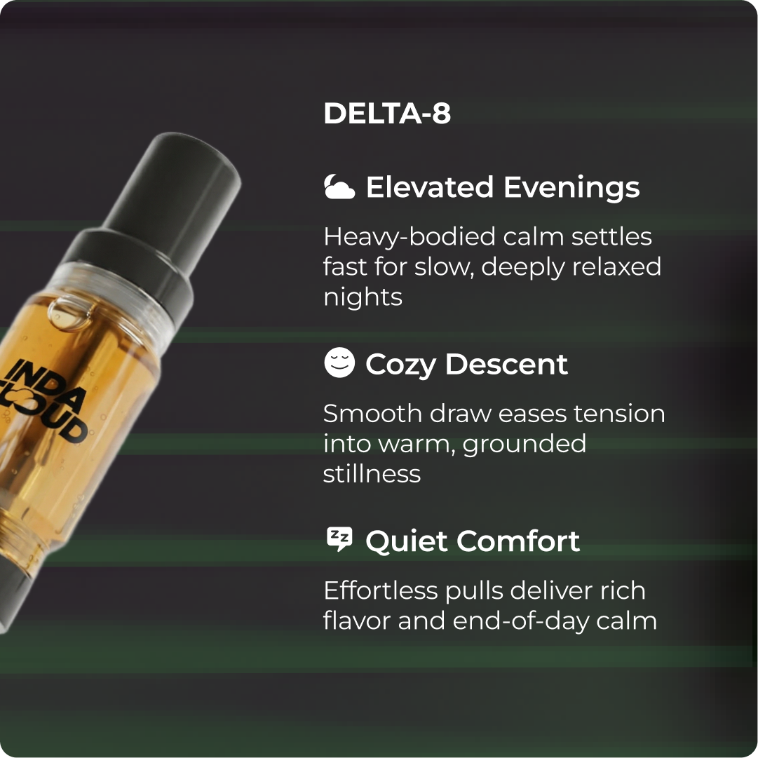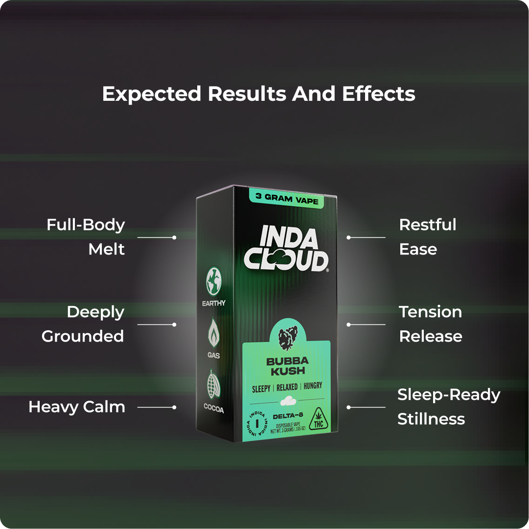 Rich coffee-chocolate diesel vibe in a sleek cartridge, Bubba Kush Delta 8 delivers soothing full-body calm and restful ease in every smooth hit.