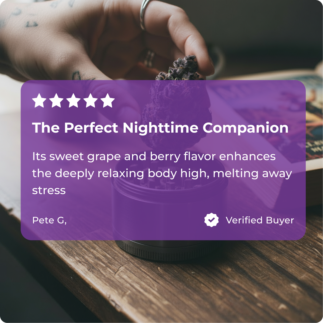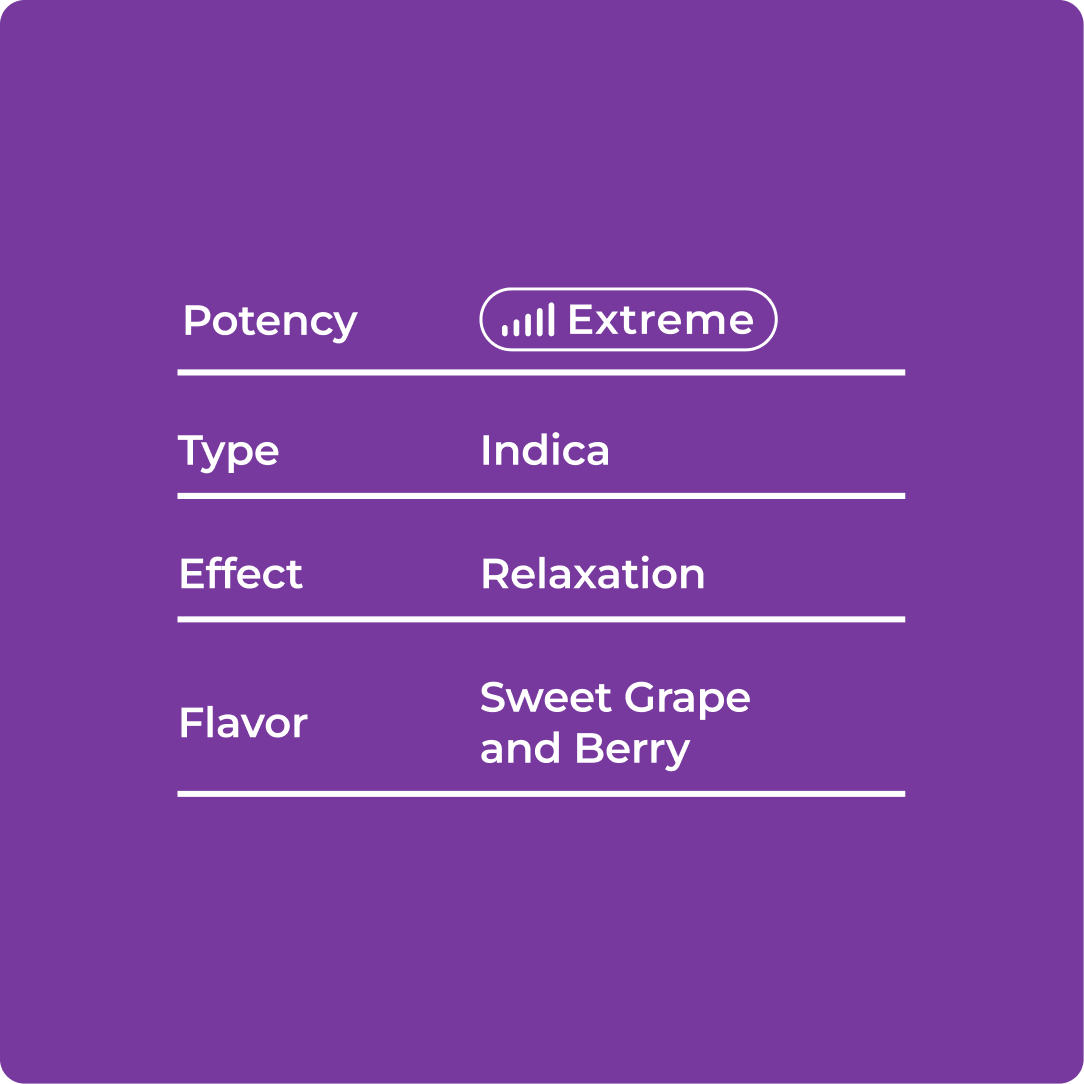 Frosty deep-purple buds deliver sweet grape-berry flavor with creamy vanilla undertones Granddaddy Purp melts stress into euphoric relaxation and smooth sedation.