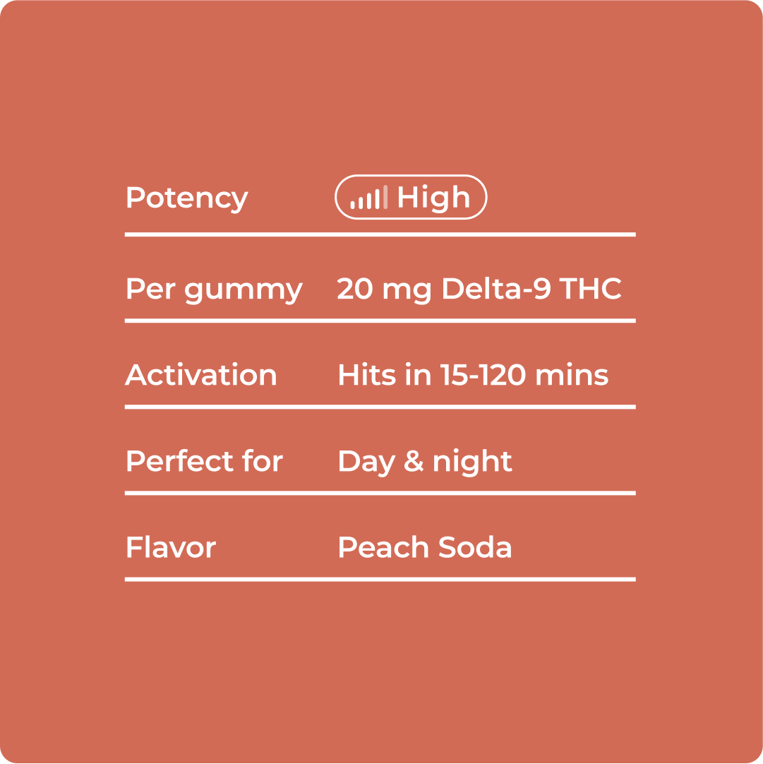 Every package of Peach Soda Shop Dispensary-Grade Delta 9 THC Gummies includes 10 gummies. Given that each individual gummy is infused with 20mg of Delta 9 THC, this brings the total potency of each bag to 200mg. When using these gummies, it's always best to start slowly, gauging your tolerance to the product and adjusting your intake accordingly. Consistent and moderate usage is the key to gaining the most benefit from these THC gummies. It's also worth remembering that these products are not for anyone under the legal age limit. Always keep the THC gummies out of reach of children and pets, and store them safely and securely.