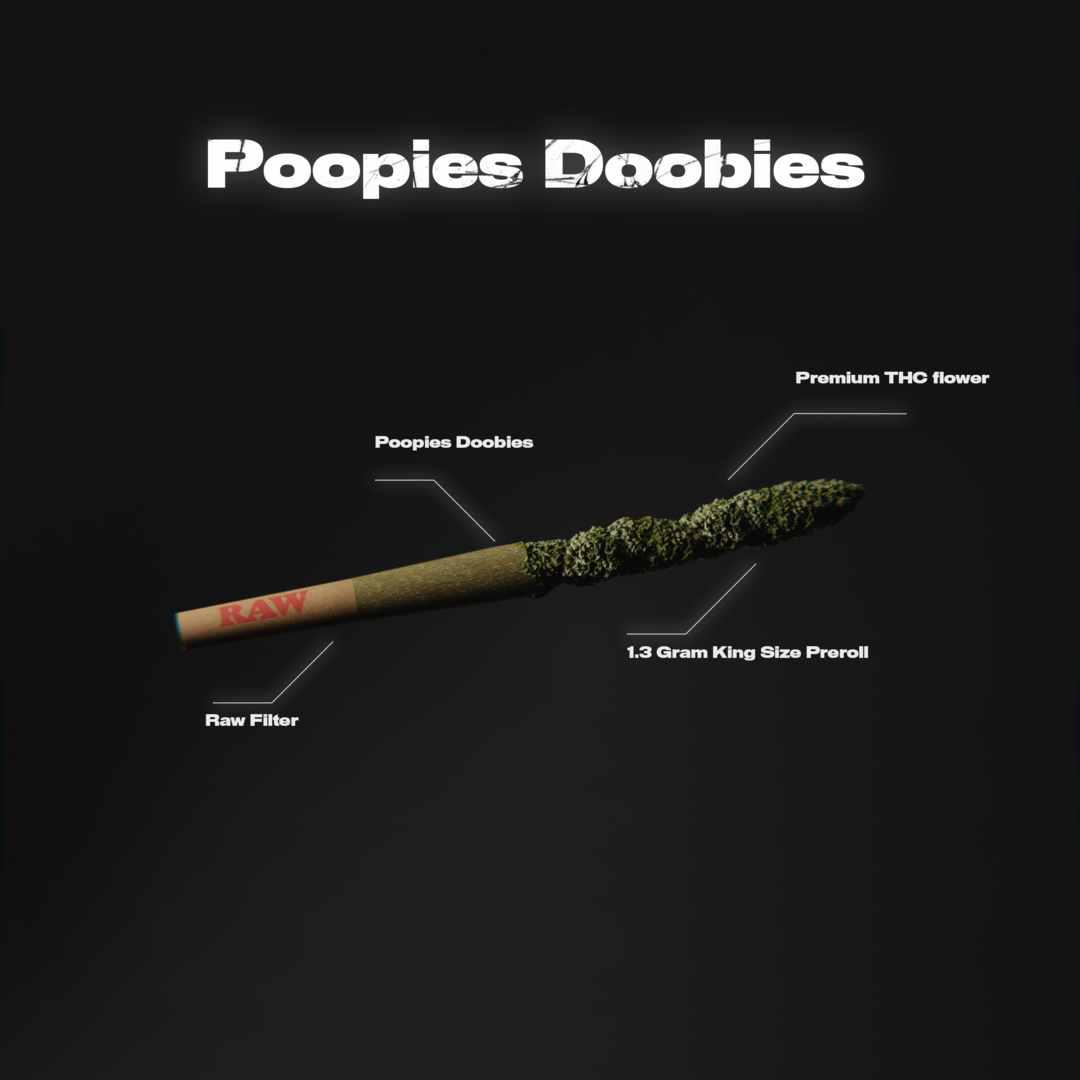 Inspired by Jackass Poopies, the "Poopies Doobies" includes two king-size pre-rolled joints, each containing 1.3 grams of high-quality flower. These pre-rolls have been meticulously crafted to offer an unparalleled smoking experience. With the convenience of pre-rolled joints, you can skip the hassle of rolling your own cones and enjoy a ready-to-smoke product. The package also ensures freshness and potency, keeping the pre-rolls in optimal condition for consumption. Whether you're a seasoned enthusiast or a newcomer to THCA, "Poopies Doobies" promises to elevate your smoking journey and provide a flavorful, relaxing encounter like no other.