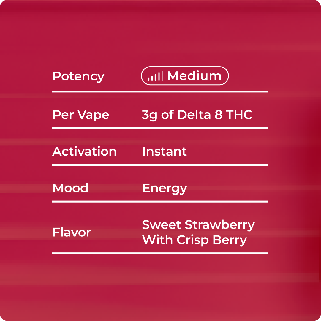 A crisp strawberry burst in a sleek vape. Strawberry Cough delivers energizing euphoria, lifted focus, and sweet-berry goodness in a convenient 3 g disposable unit.